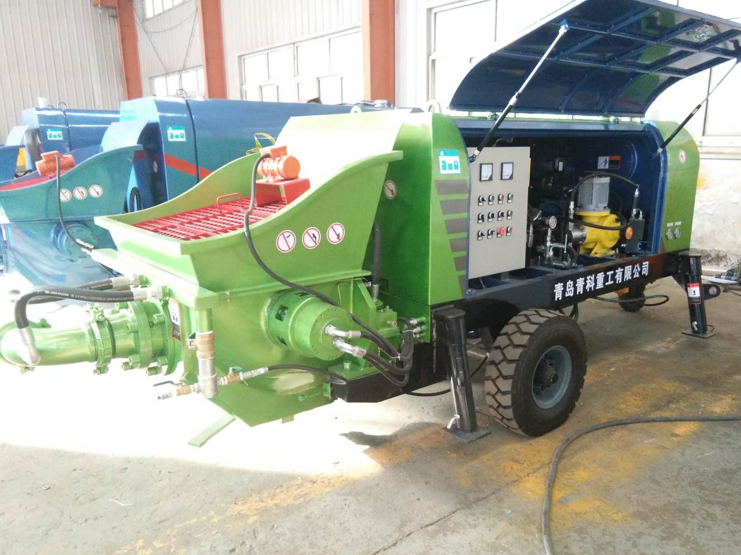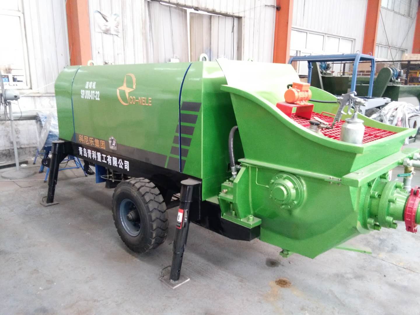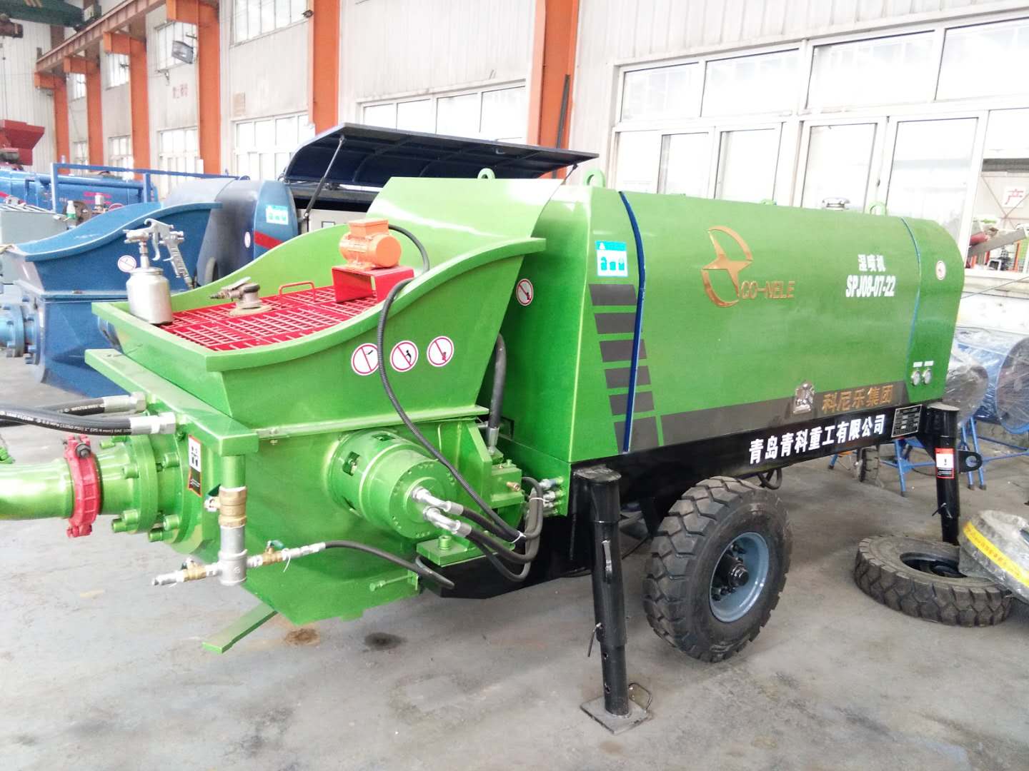 青岛青科重工有限公司是集科研、生产、销售及售后服务于一体的专业研制大型建设机械设备的企业。该公司的混凝土湿喷机具有以下技术特点:1.喷射量连续可调(无级变速)。2.速凝剂添加量连续可调。3.集中润滑系统,有效延长了磨损件的使用寿命。4.产品轮式设计小巧灵活、移动方便、维护简单5.原装进口伊顿阀组和分体活塞。5.泵送压力高,输送喷射距离远。6.高性能:喷层混凝土性能高,密实、均匀、高强度。7.速凝剂添加与控制技术:国内名牌计量泵计量准确,雾化射流与喷嘴物料混合使得速凝剂与混凝土混合均匀。8.降低了机旁和喷嘴外的粉尘浓度。消除了对工人健康的危害。9.回弹度低,干喷时,混凝土回弹度达15%-50%,采用湿喷技术,回弹率甚至可降低到10%以下,有效节约成本。